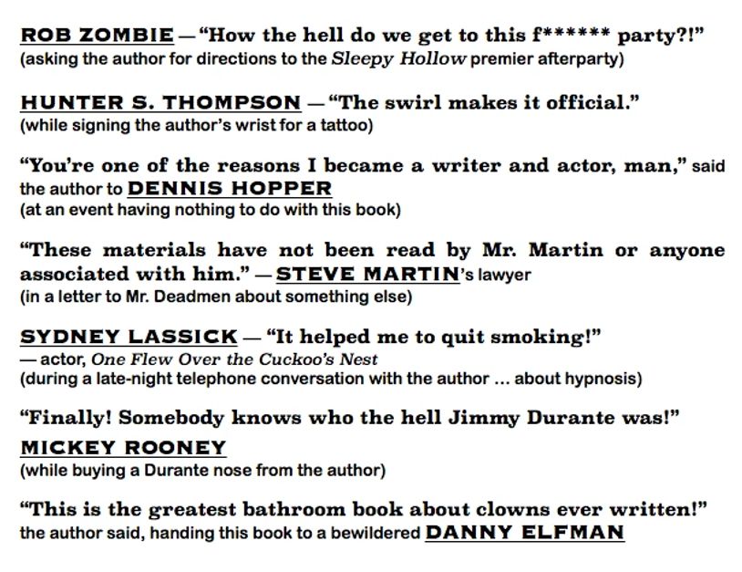With wit akin to Steve Martin's Cruel Shoes and Woody Allen's Side Effects, Deadmen will delight you even if clowns aren't your "thing." From the thespian clowns planning a trek across America on their tricycles in an homage to Easy Rider, to Mephistophelian pacts with the Devil, you'll find out what lurks behind the doors of the most thrilling freak show on Earth! Some may think it bizarre humor ... others will simply call it a collection of ingenious, satirical vignettes about clowns imitating art, and life imitating clowns ... we just call it: "Clowns," Chronicles & Paper Dots.